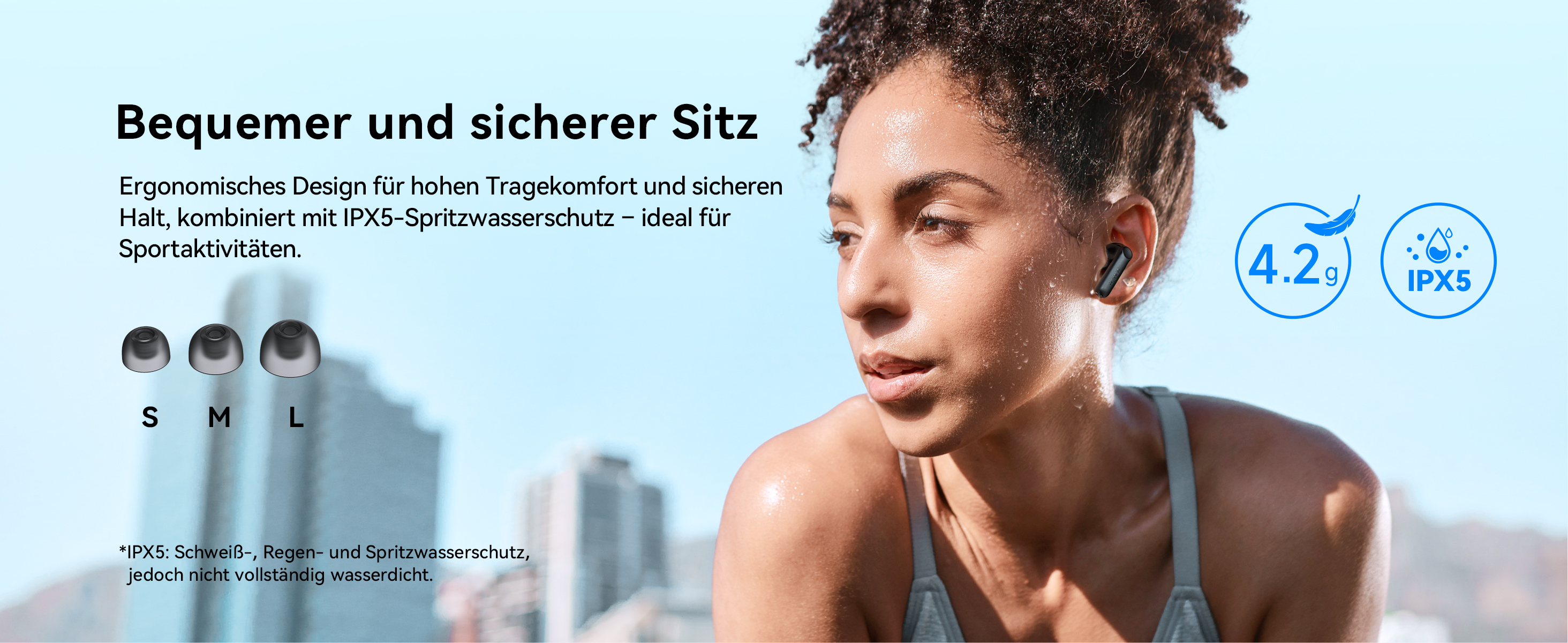 Das elegante, minimalistische Design der EarFun Air Life fällt sofort ins Auge. Die Ladehülle fühlt sich dank des matten Finishs nicht nur hochwertig an, sondern ist auch äußerst praktisch, da sie kaum Fingerabdrücke zeigt. Die Kopfhörer selbst sitzen durch ihre ergonomische Form sicher und bequem im Ohr – perfekt für lange Hörsessions oder sportliche Aktivitäten. Mit ihrer IPX7-Zertifizierung sind sie zudem vollständig wasserdicht und somit ideal für jede Wetterlage oder das Training.