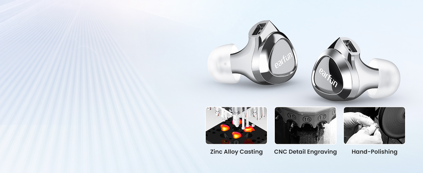 Die EH100-Ohrhörer bestehen aus einer gegossenen Zinklegierung und machen die Kopfhörer sowohl langlebig als auch schön. Sie verfügen über eine robuste Vollmetallkonstruktion, die anschließend von Hand poliert wird, um ein hochglänzendes Finish zu erzielen, das fast dem Glanz von Diamantohrringen in Ihren Ohren ähnelt.