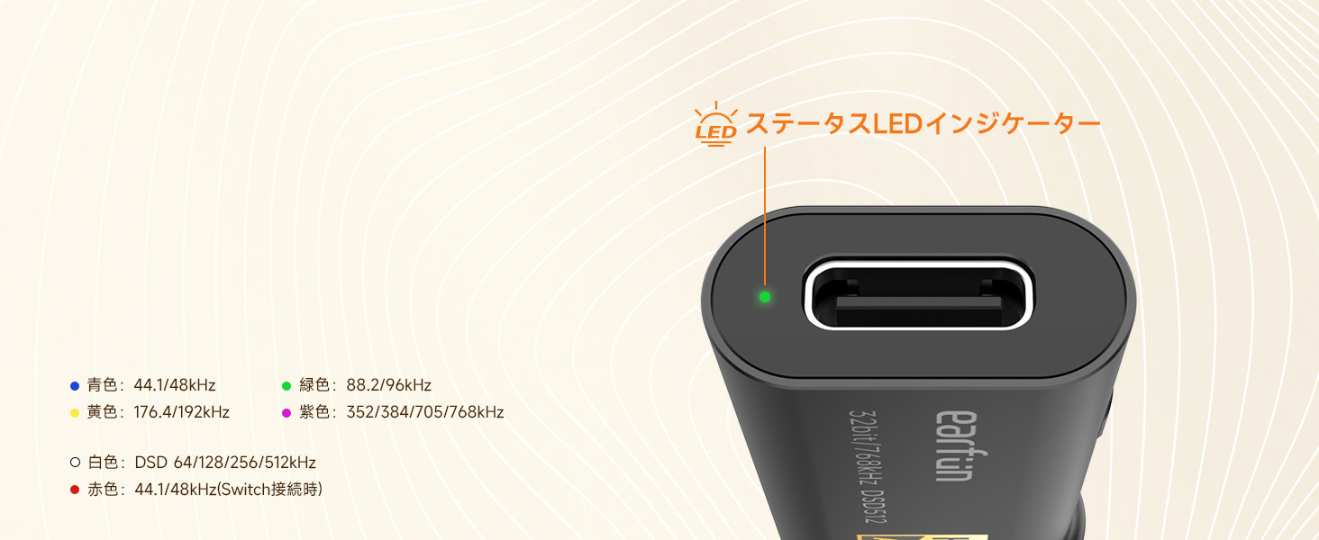 UA-100は最大で768kHz/32bitの仕様をサポートし、異なるサンプリング周波数に対応する異なる色の表示ライトがあり、現在の仕様が一目で分かります。