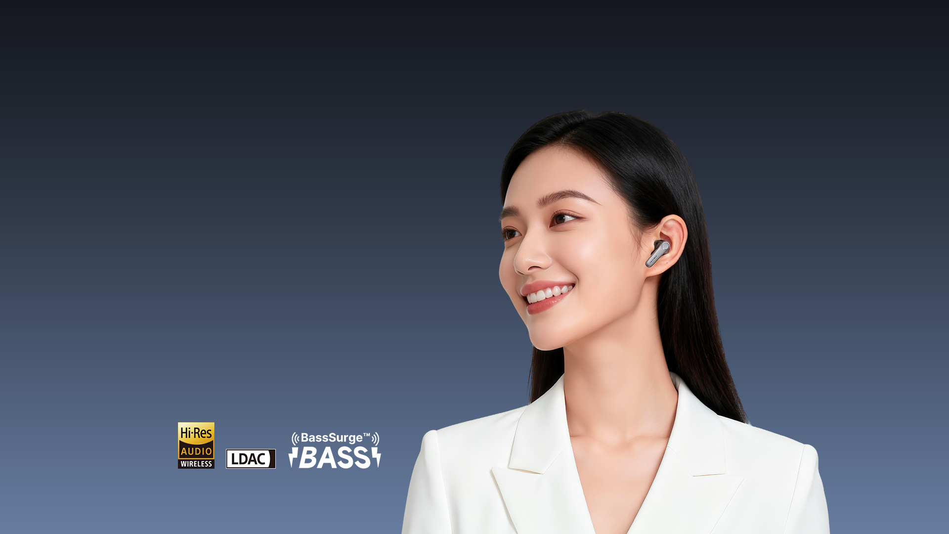 Hi-Res Audio認証を取得し、LDAC™対応 により最大 990 kbpsの高速伝送が可能。従来の標準Bluetooth(SBC)の約3倍以上のデータ量を送信できるため、最大 24bit/96kHz の高分解能音源も忠実に再現。さらに、3Dサラウンド音效とEarFun独自の低音強化技術 BassSurge™ により、深みのある低音から繊細な高音まで、音の細かいニュアンスをより立体的に楽しめます。