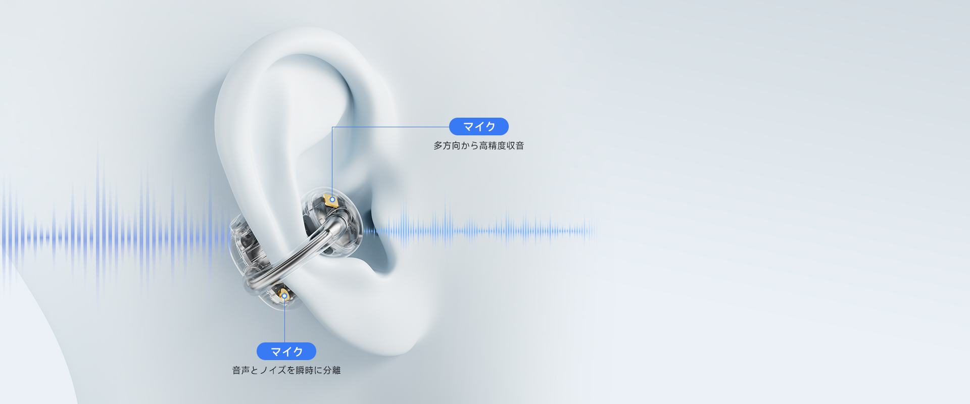 4基のマイクと最新のAIノイズ低減技術を搭載。周囲の雑音と話し声を高精度で検知し、AIアルゴリズムが音声信号を解析してノイズを分離。電車やバス、カフェなどの騒がしい環境でも、クリアで自然な通話を実現します。