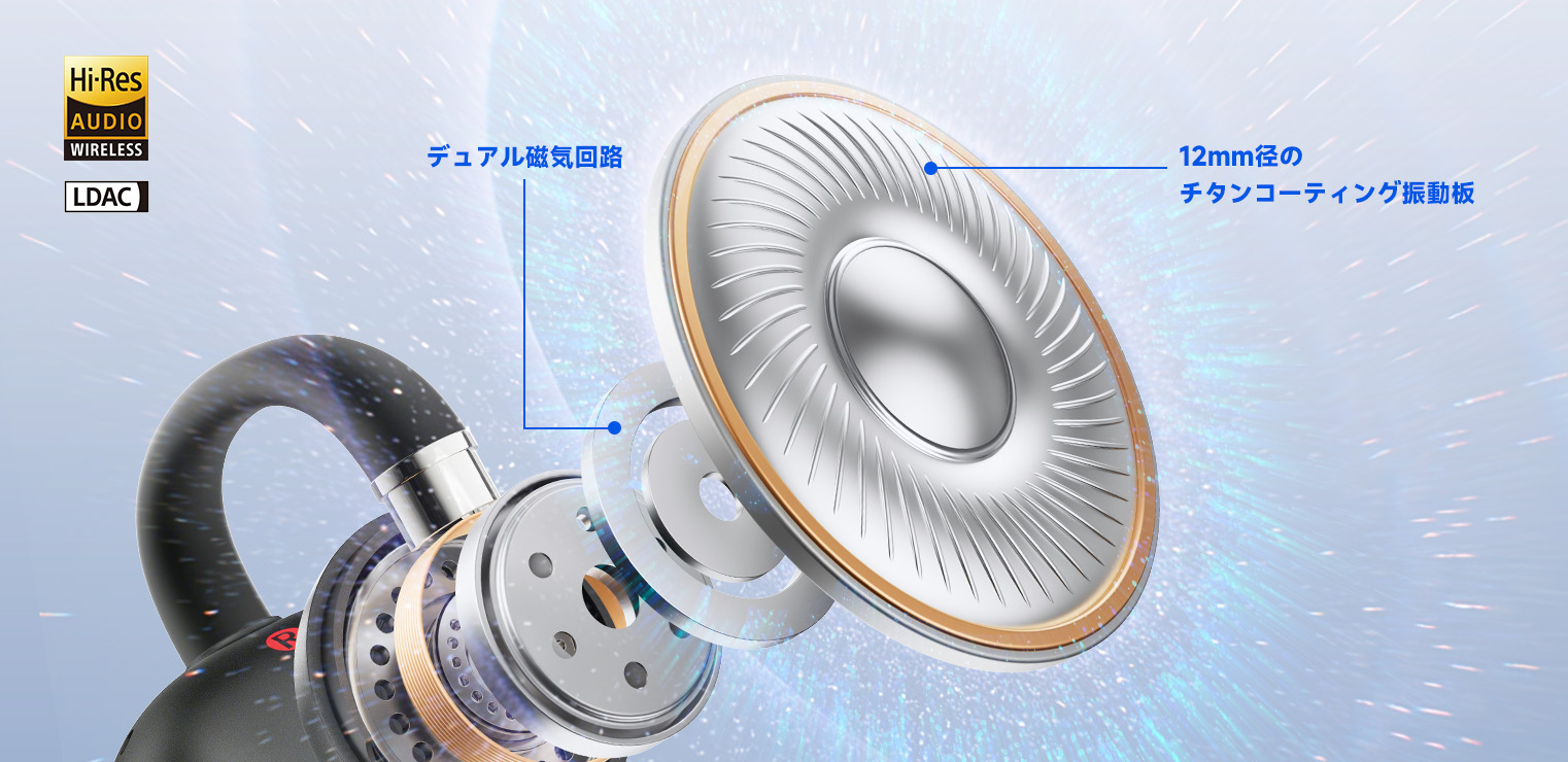 軽くて強いチタン素材を使用し、歪みの少ないクリアな音質を実現。 音の立ち上がりがシャープで、低音から高音までバランスよく再生し、細かい音のディテールも鮮明に再現します。